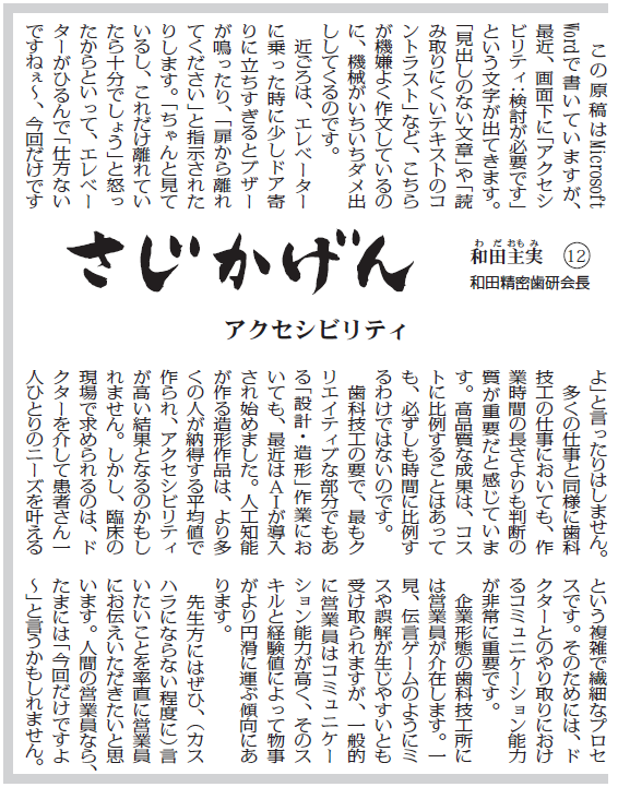 この原稿はMicrosoft Wordで書いていますが、最近、画面下に「アクセシビリティ:検討が必要です」という文字が出てきます。「見出しのない文章」や「読み取りにくいテキストのコントラスト」など、こちらが機嫌よく作文しているのに、機械がいちいちダメ出ししてくるのです。